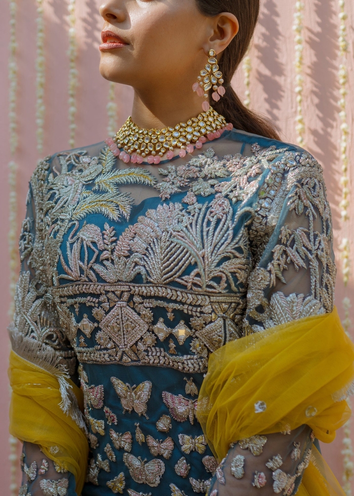 The blue butterfly net shirt is handcrafted with silver embellishment while the butterflies are scattered from the waist to the hem of the shirt. the shirt is finished in accent color in satin with medium silk lining. The pants are made in rose gold net. The gharara pants have a spray of mirror motifs.