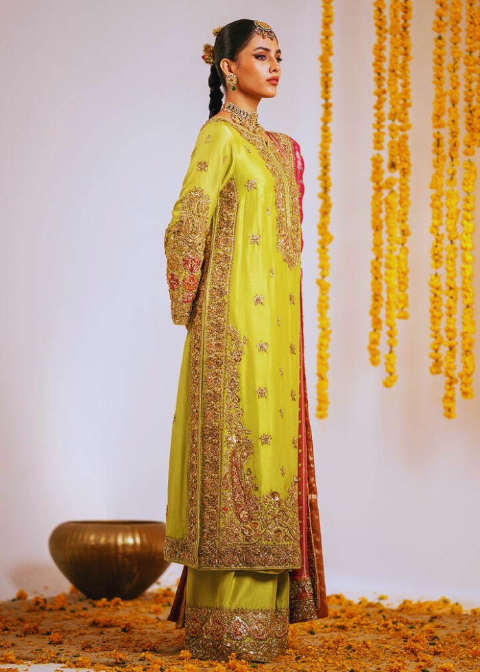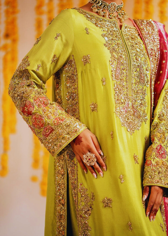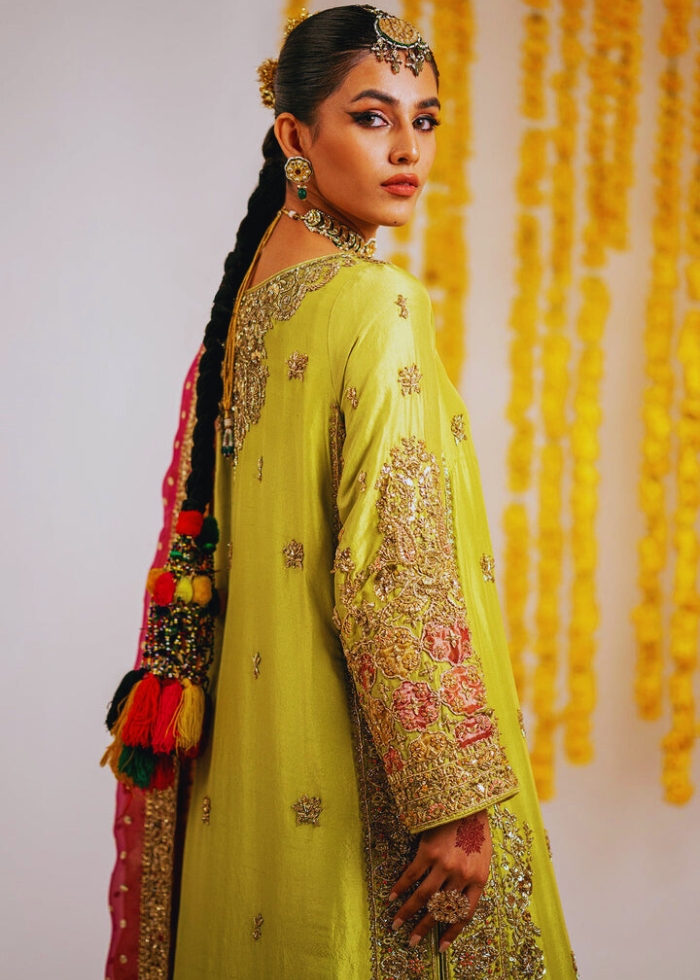 Pakistani Wedding Dress in Kameez Trouser style achieves the final ravishing look when paired with an embellished dupatta. This dupatta in pink color is adorned with embellished borders, goldwork, sequins, and tilla, making it a perfect choice to pair with the Mehndi Dress.