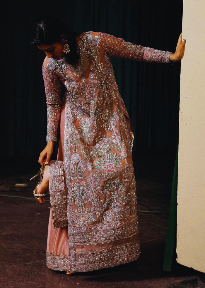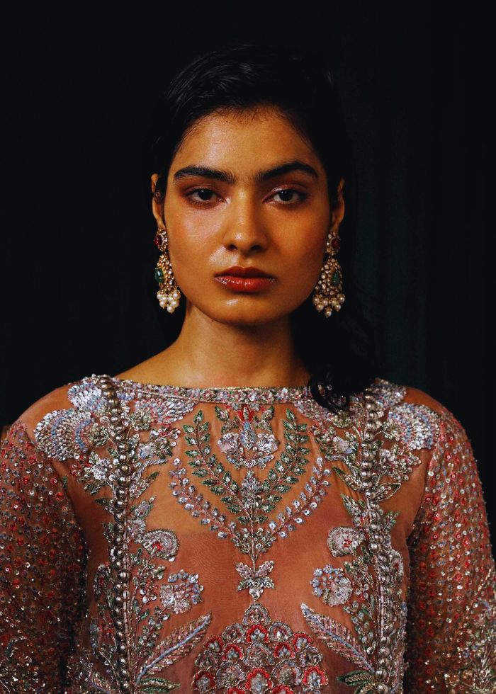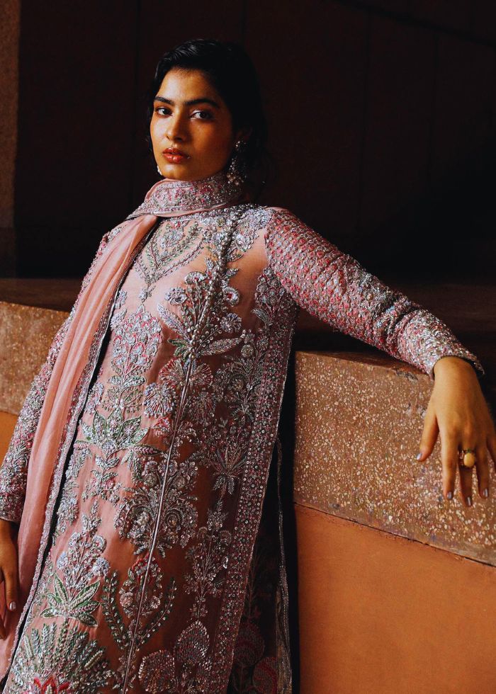 This regal outfit rendered in a beautiful shade of Pink on an organza canvas for shirt and Raw-silk palazzo, with heavy embellished motifs along with intricate details. The timeless look is completed with an organza dupatta along with four side heavy embellished borders with 3 different corner motifs embellished with sequins, cut dana and with nakashi, dabka concluding the look marvelously.